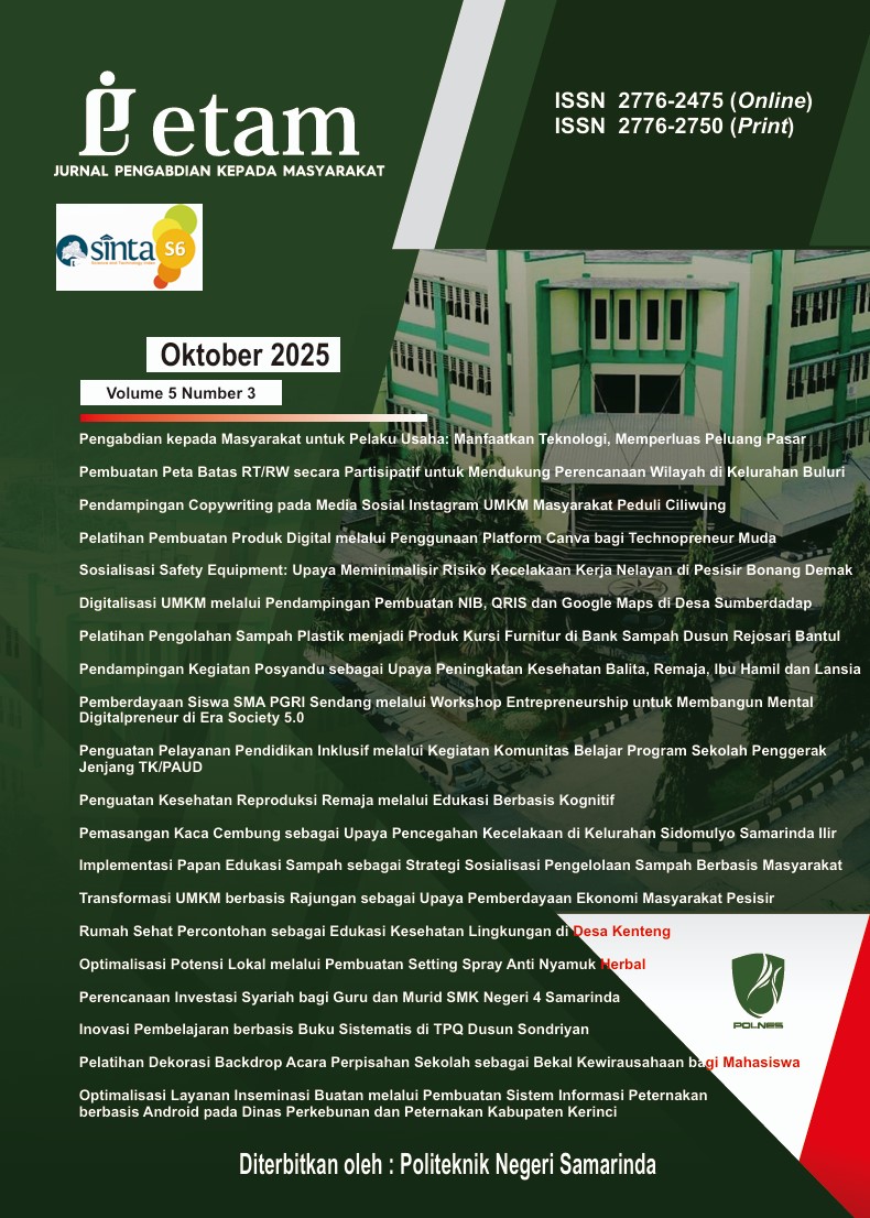 ETAM: Jurnal Pengabdian kepada Masyarakat is managed by P3M Politeknik Negeri Samarinda with ISSN 2776-2475 (online) and ISSN 2776-2750 (print). This journal published manuscripts as results of community service activities from various disciplines, which contribute to improving the quality and skills of the community, the application of research results, and the use of appropriate technology.
